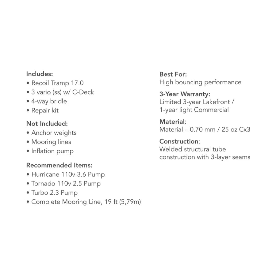 Elevate your water fun with the Aquaglide Recoil Tramp 17.0, a 17’ x 17’ bouncing powerhouse built for larger families, teens, and adult friends. Featuring a rigid Octane frame, stainless steel springs, a C-Deck boarding platform, and a 4-way anchor bridle, this trampoline delivers superior bounce performance. Crafted with fully welded, reinforced Duratex™ construction, it offers years of residential durability and includes D-rings for connecting slides, logs, or other Aquaglide accessories on two sides. Perfect for lakefronts or water parks—bounce into action! (Note: Anchoring accessories sold separately.)