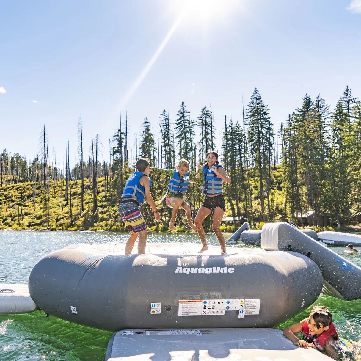 Create epic water memories with the Aquaglide Ricochet Bouncer 16.0 Aquapark, a 26.2’ x 26.0’ floating playground perfect for family and friends. This expansive 16-foot bouncer offers excellent bounce without the complexity of metal frames or springs, plus ample space for lounging. Featuring a C-Deck platform for easy boarding, this aquapark package includes a Slide, 50/50 Log, and fully welded Duratex™ construction for lasting durability. Designed for up to 8 people, it’s ideal for lakefronts—bounce, slide, and balance in style! (Note: Anchoring accessories sold separately.)